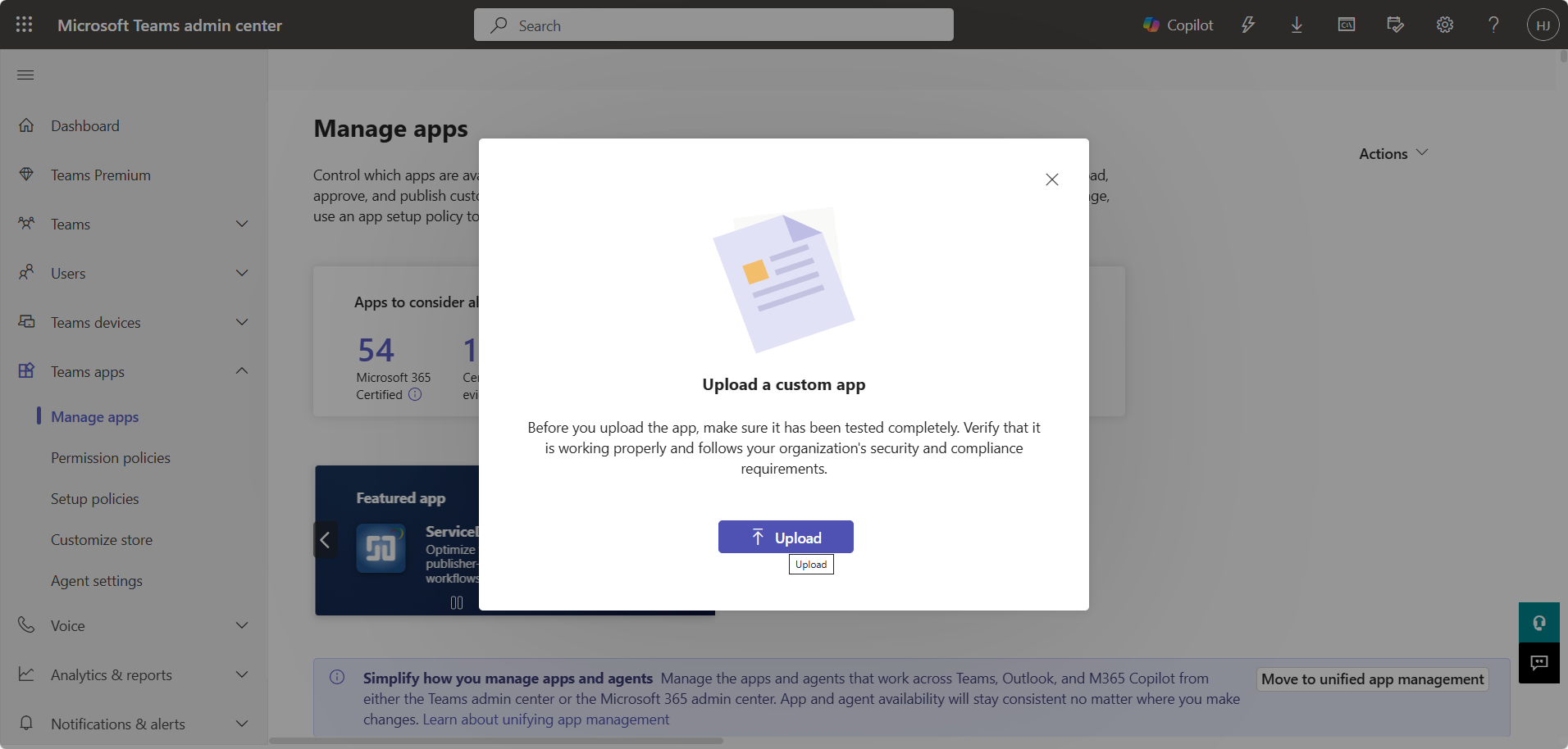 This is the hero deployment path for production environments. A Teams admin uploads and deploys the app directly via the Teams Admin Center, unlocking powerful distribution features.