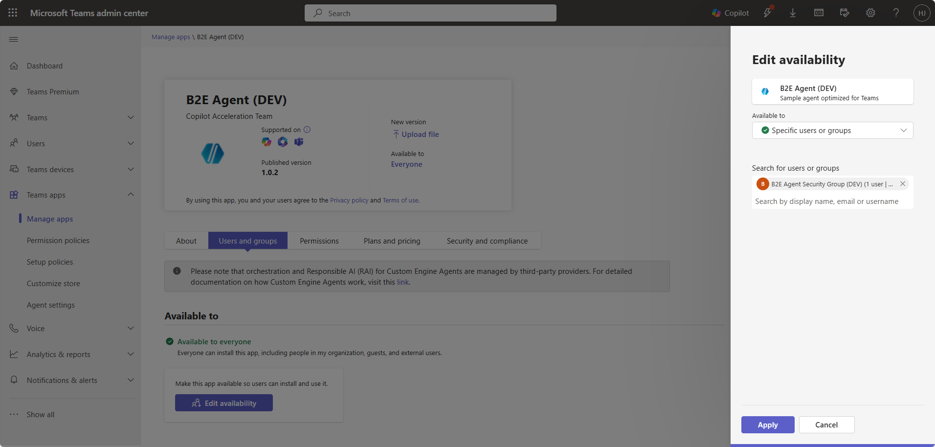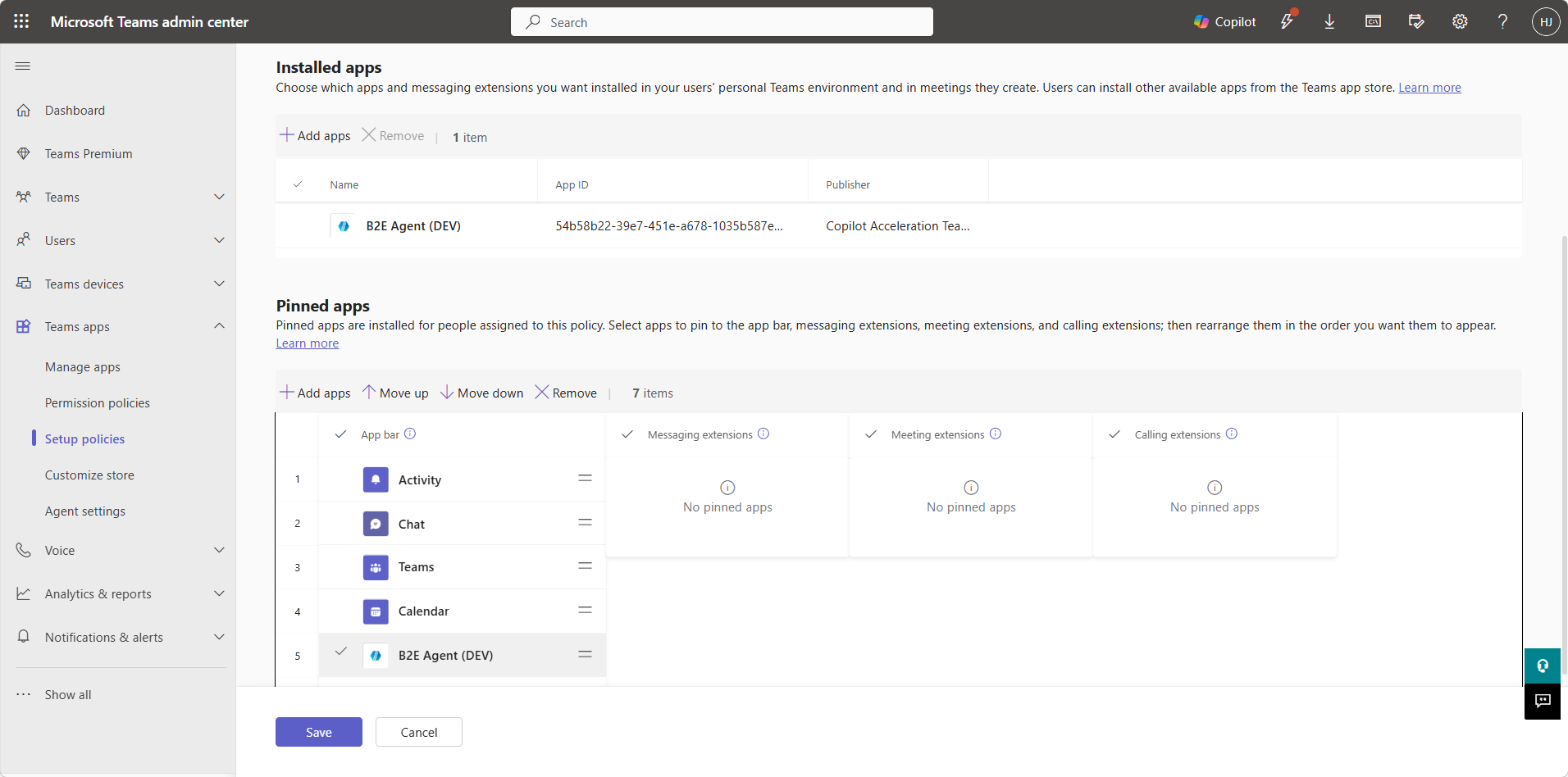 This is the most controlled and scalable option for production rollouts. The ability to auto-install and pin apps transforms the user experience—instead of asking users to search for and install your agent, it simply appears in their Teams sidebar, ready to use.