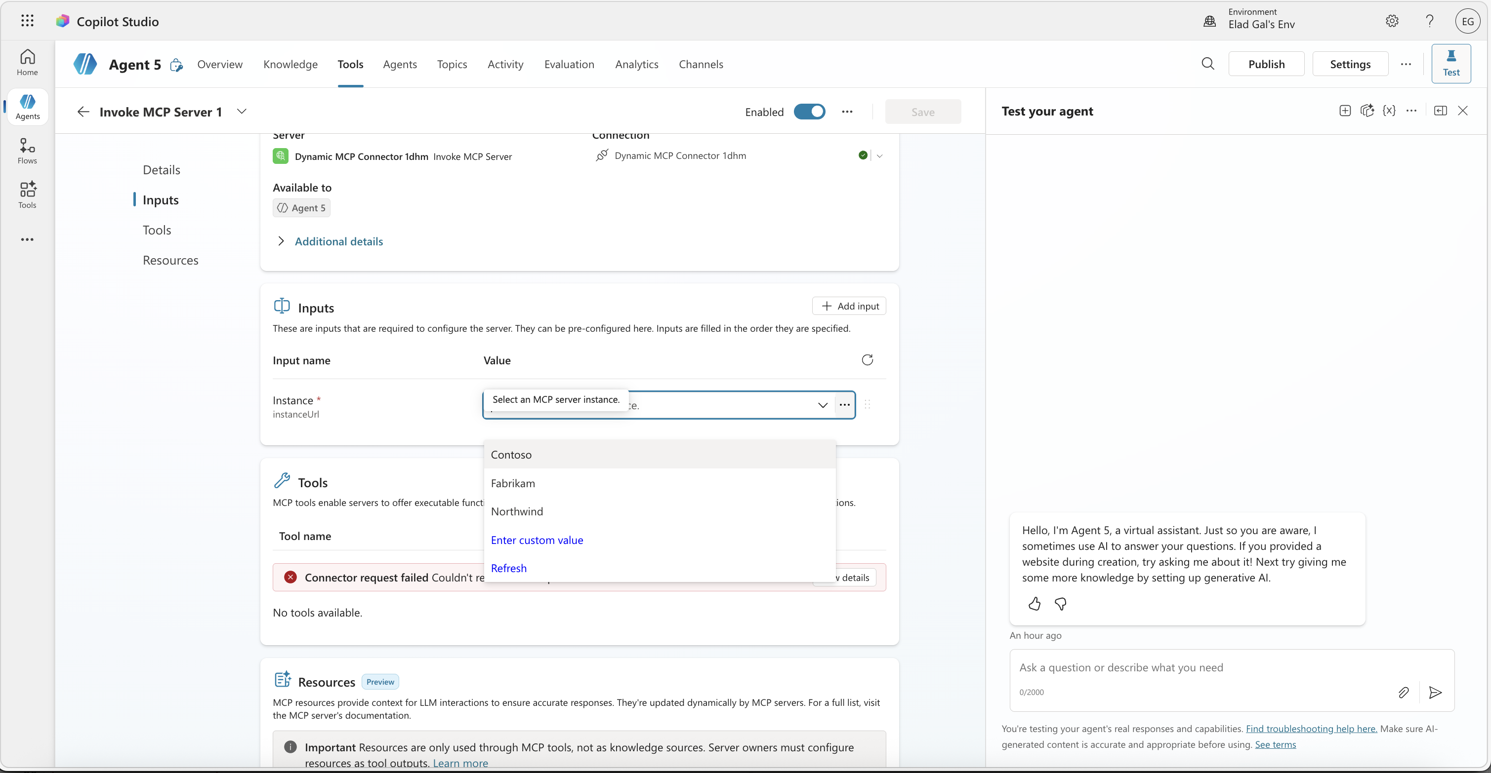 Notice the Tools section at the bottom is in an error state. That’s expected: without a selected instance, the connector doesn’t know which MCP endpoint to query for tools. The maker picks an instance from the dropdown, and the connector now has an endpoint to talk to: