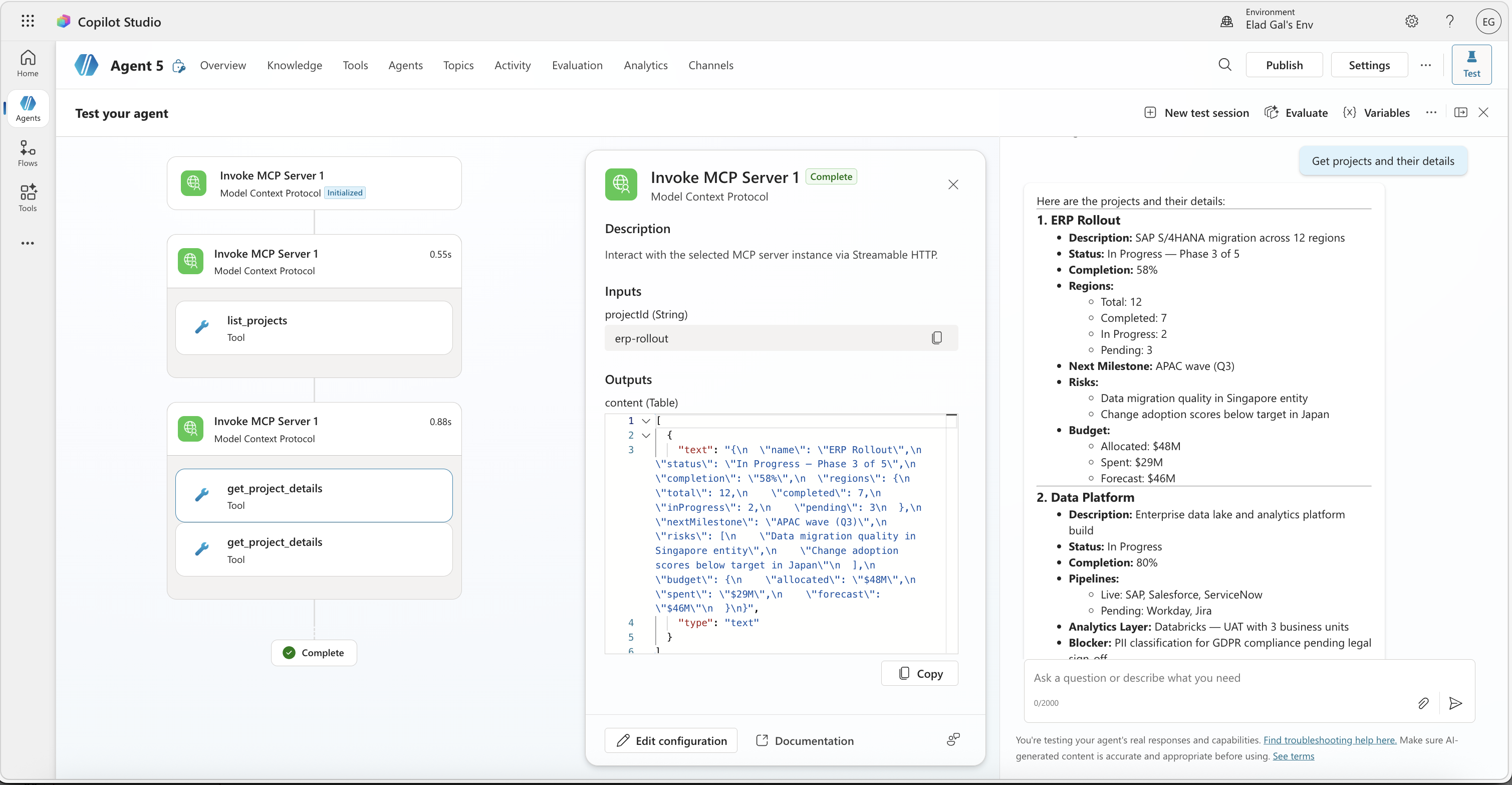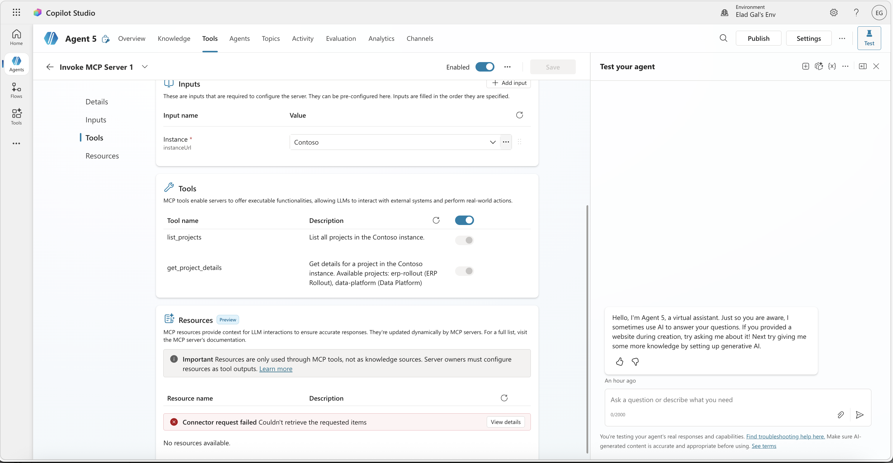 The tools section now shows list_projects and get_project_details, discovered from the Contoso MCP endpoint. The maker didn’t type a URL or configure anything beyond selecting a name. From here, they can test the agent and see the tools in action: