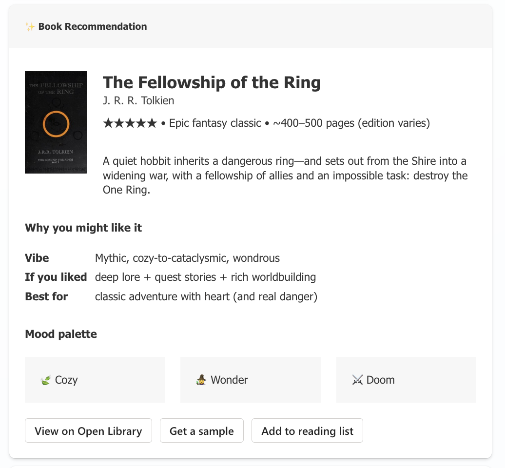 Let’s look at a real example. Say you’re building a book recommendation agent (because why not), and you want to present recommendations as beautiful Adaptive Cards: