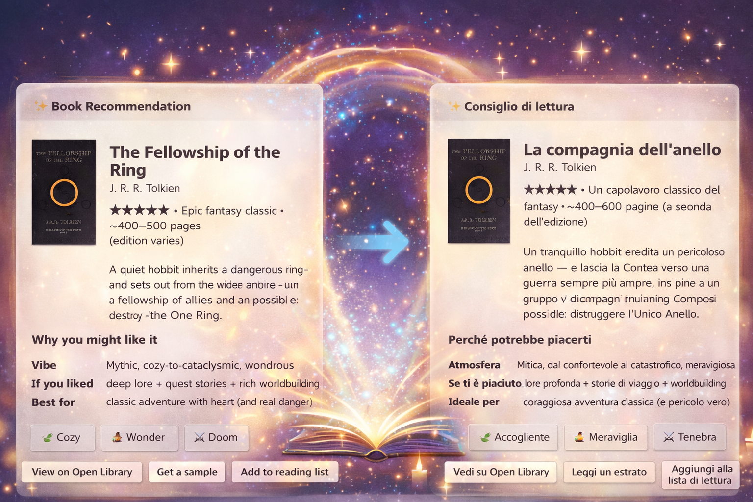 "fallbackText": "Book recommendation: The Fellowship of the Ring by J. R. R. Tolkien",