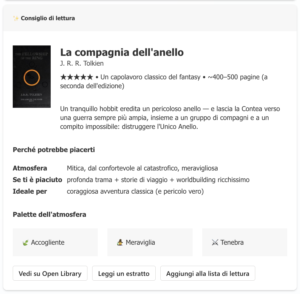 "'dialog(copilots_header_392e9.topic.recommendbooks)'.'trigger(main)'.'action(sendActivity_a7aWmy)'.Activity.Attachments[0].CardContent.fallbackText": "Consiglio di lettura: La compagnia dell'anello di J. R. R. Tolkien"