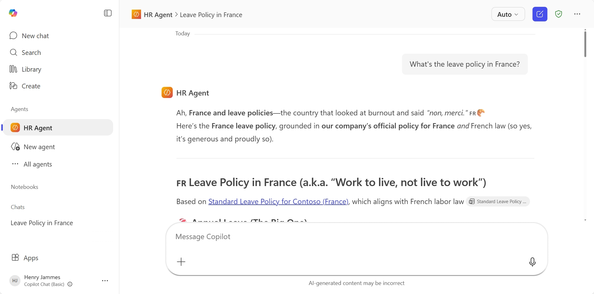 A declarative agent using a SharePoint knowledge source for grounding