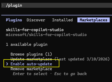 In Claude Code, you can simply type /plugin and then use your arrow keys to navigate to the plugin to find “Skills for Copilot Studio”. Once you find it, select it, and make sure to enable auto-updates.