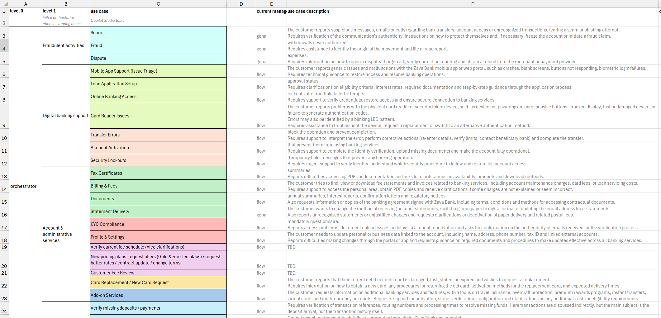 @copilot-studio:author I received the attached excel file with more than 30 different use-cases. My current architecture is giving a lot of disambiguation errors, as well as triggering wrong tools for the given questions. Help me refactor this agent so that it scales.