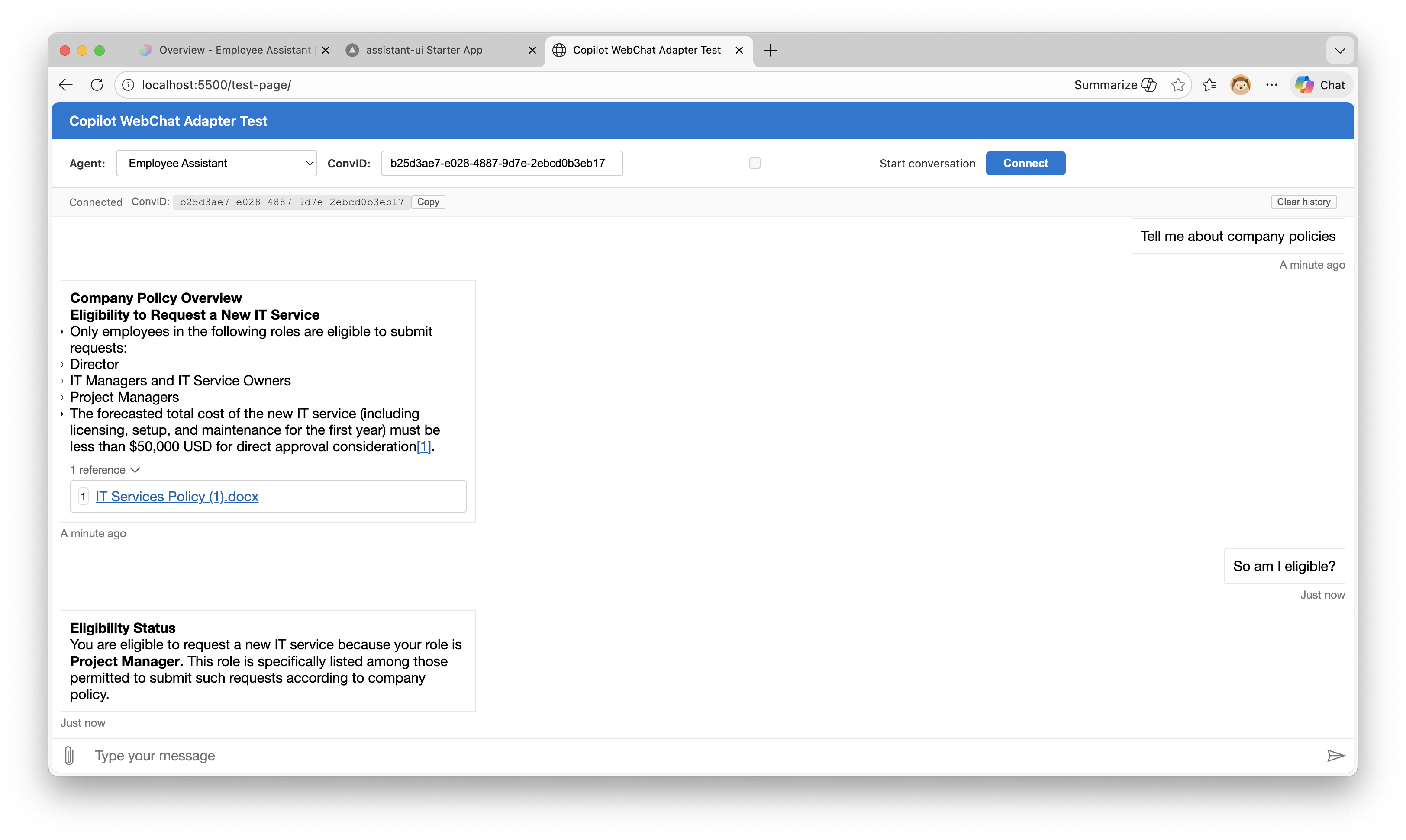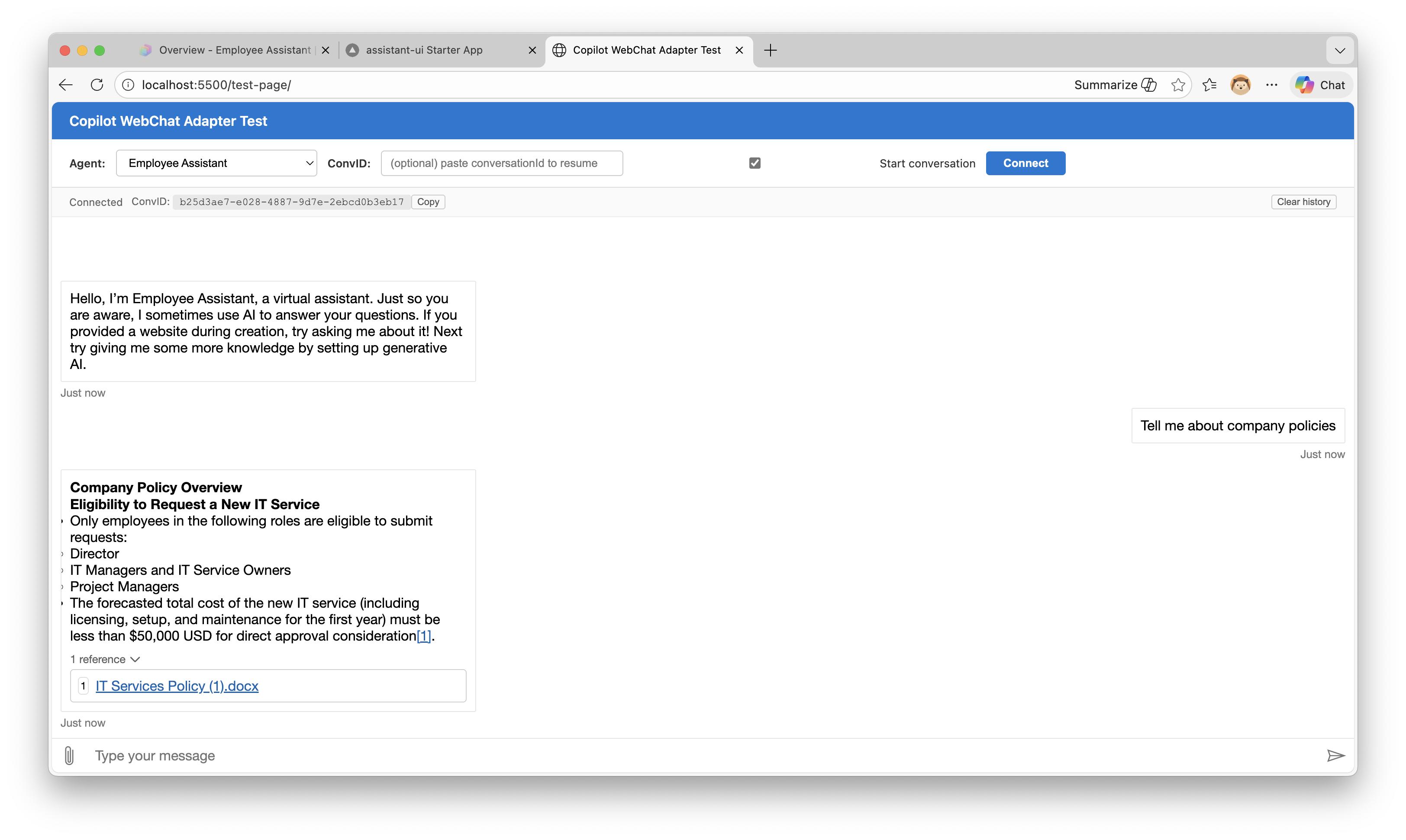 Here’s a first conversation. The user connects, the greeting streams in, and they ask a question about company policies. Notice the conversation ID in the status bar: