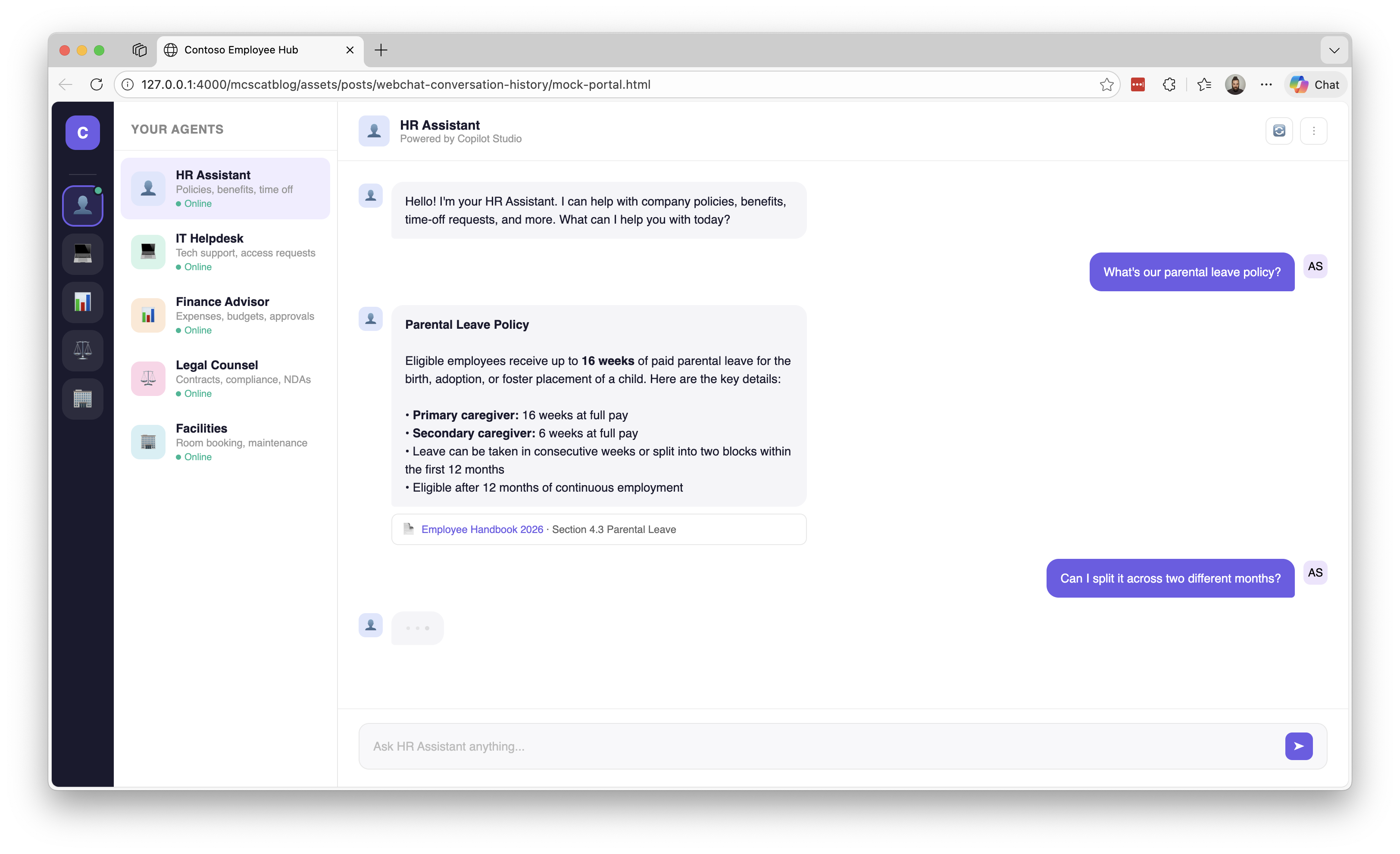 A customer we’ve been working with is doing exactly that. They’re building a custom employee portal where every department has its own AI-powered specialist. HR policies, IT support, finance approvals, legal guidance, all accessible from a single app, each agent grounded on its own domain-specific knowledge.