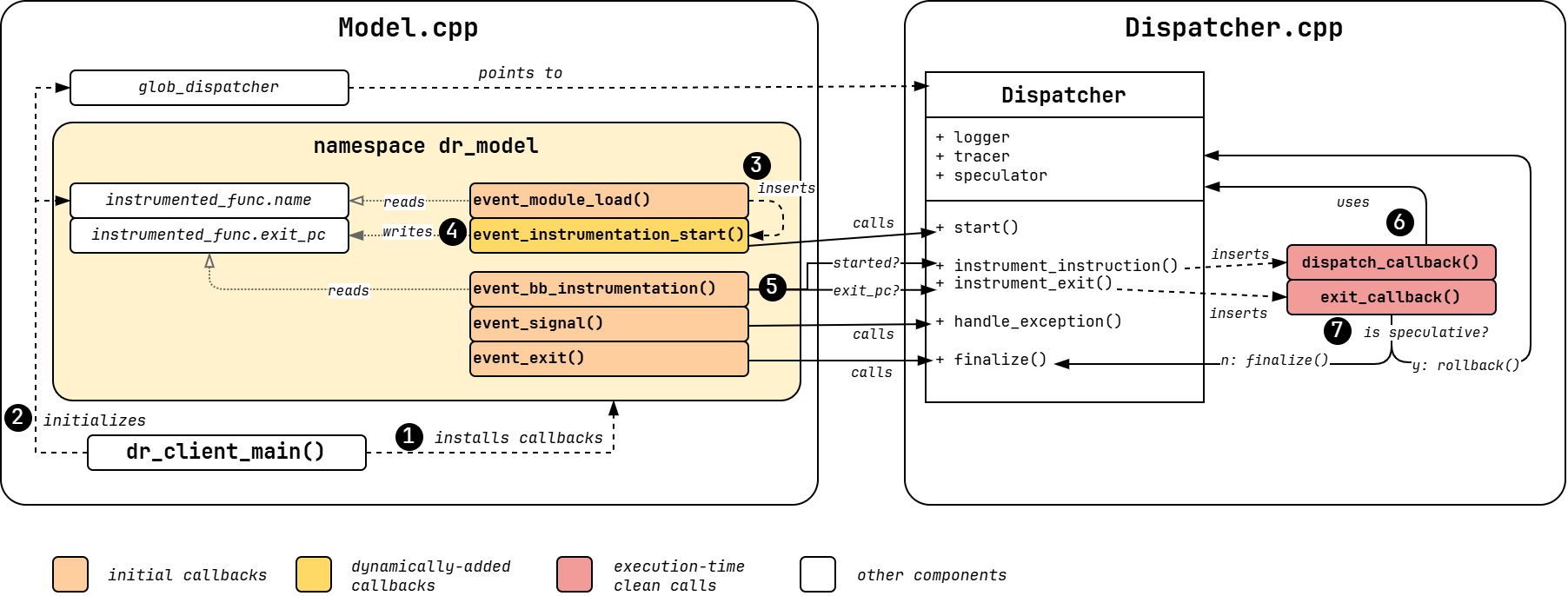 The instrumentation components modify the binary of the test case loader by adding a call to the function dispatch_callback before every instruction in the binary (or more specifically, every instruction in the test_case_entry function of the loader).
