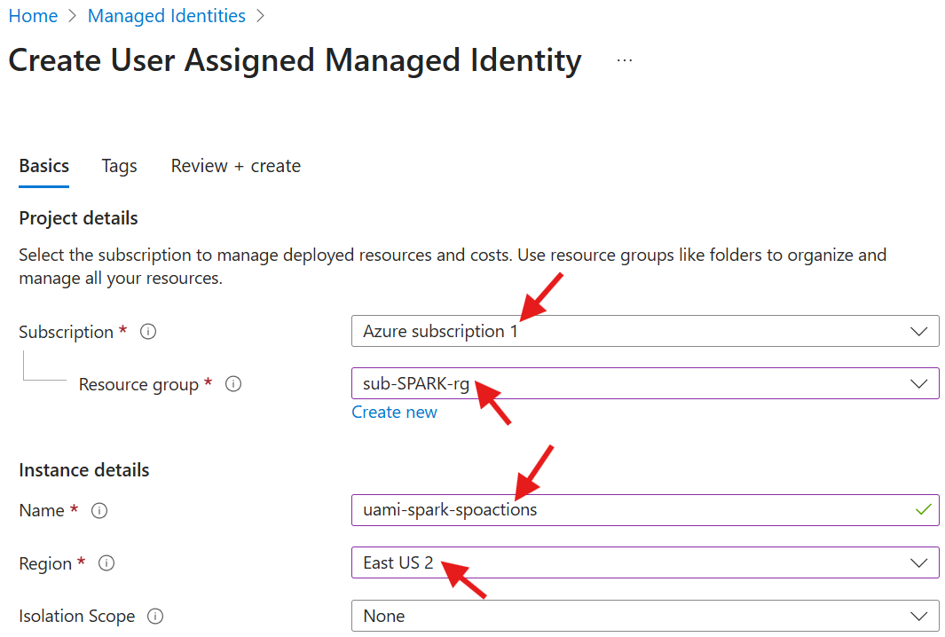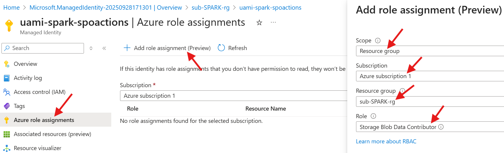- Open the uami-spark-spoactions UAMI