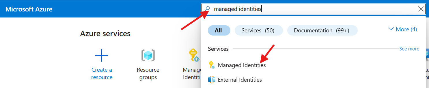 - From the top search bar, enter Managed Identities and select it from the search results