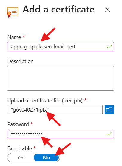 | Upload a certificate file | The .pfx certificate file Private Key Required |