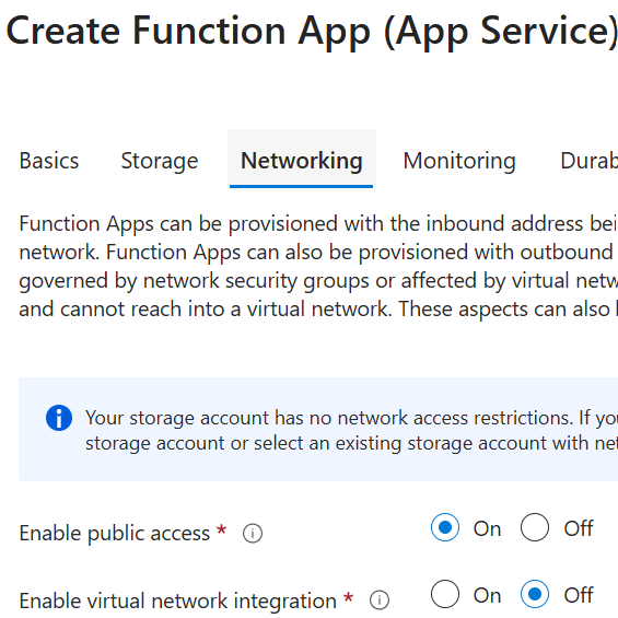 The function app will utilize a public endpoint, but requires authentication from the SPARK application registration. The SPFx solution will request a token from the application registration which is used as the authentication to call the function app. The function app’s CORS configuration will also allow incoming requests from the SharePoint environment.