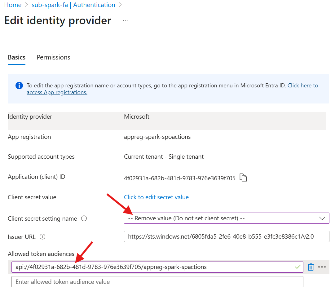 - Set the Allowed Token Audiences value to the appreg-spark-spoactions application id uri