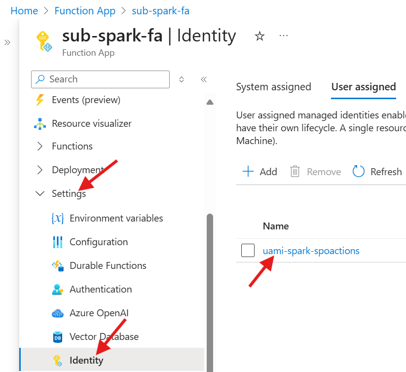 - Click on the User assigned tab and validate that the uami-spark-spoactions identity is added