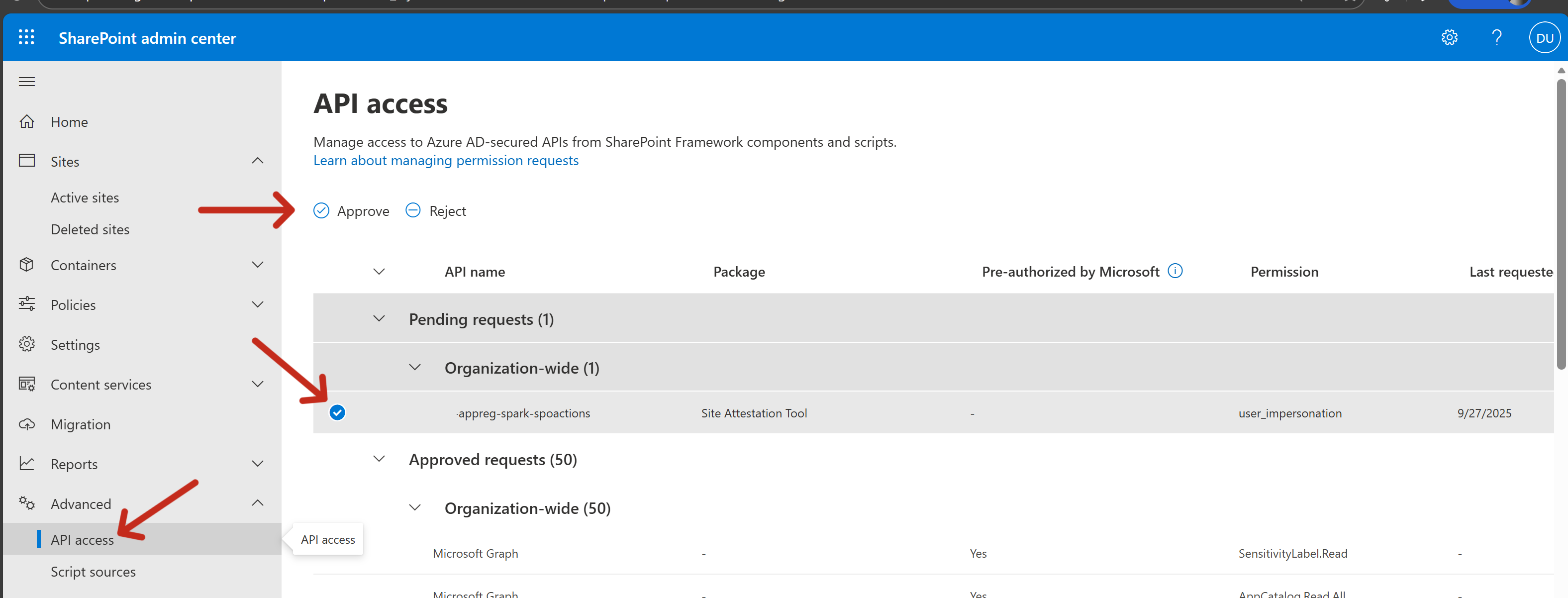 - Once the applications are added, we will need to approve the API request for the site-attestation SPFx app from SPO Admin Center. This is required in order for the authentication to work from SPFx to call the Function App with the associated AppReg.
