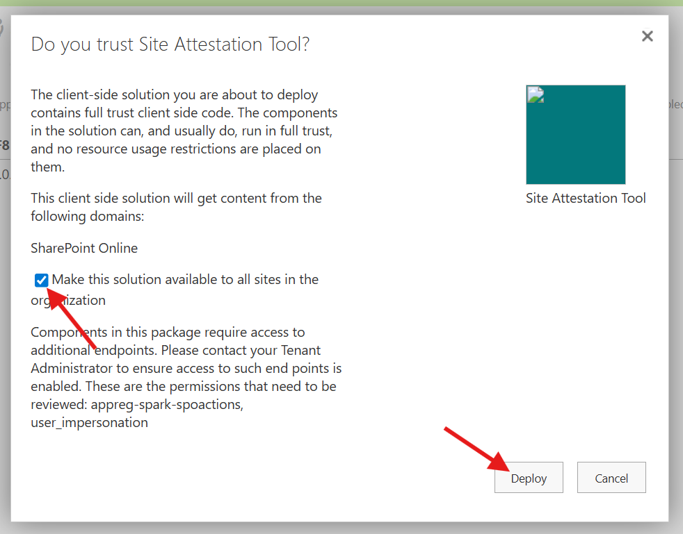 Requirements: This step will require the site-admin.sppkg and site-attestation.sppkg files.