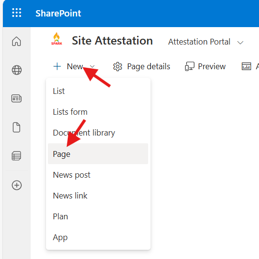 - Create a site page using the Blank Page template and set the title to Attestation Portal