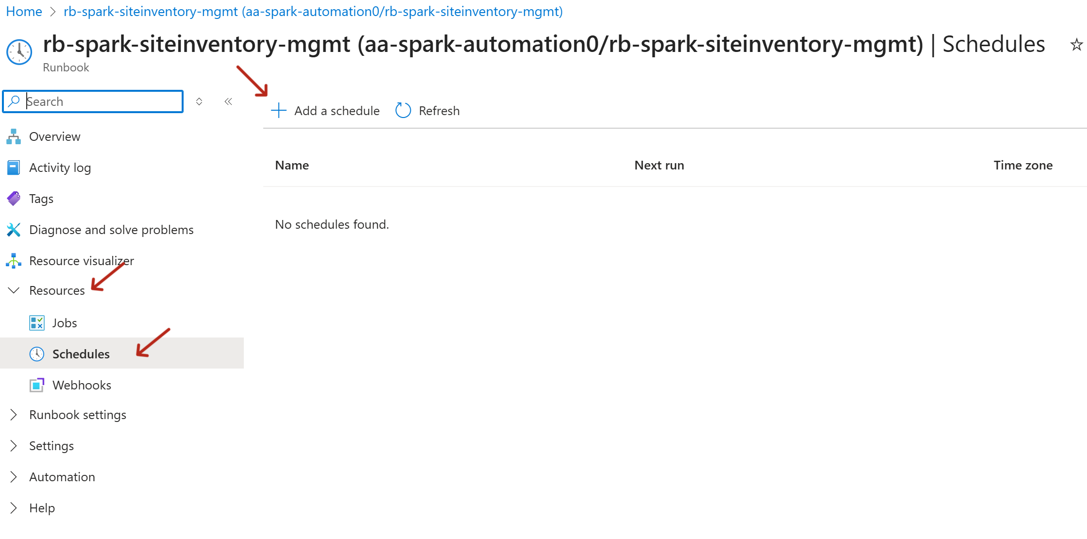 - On the left hand side under Resources, select Schedules. Click Add a Schedule.