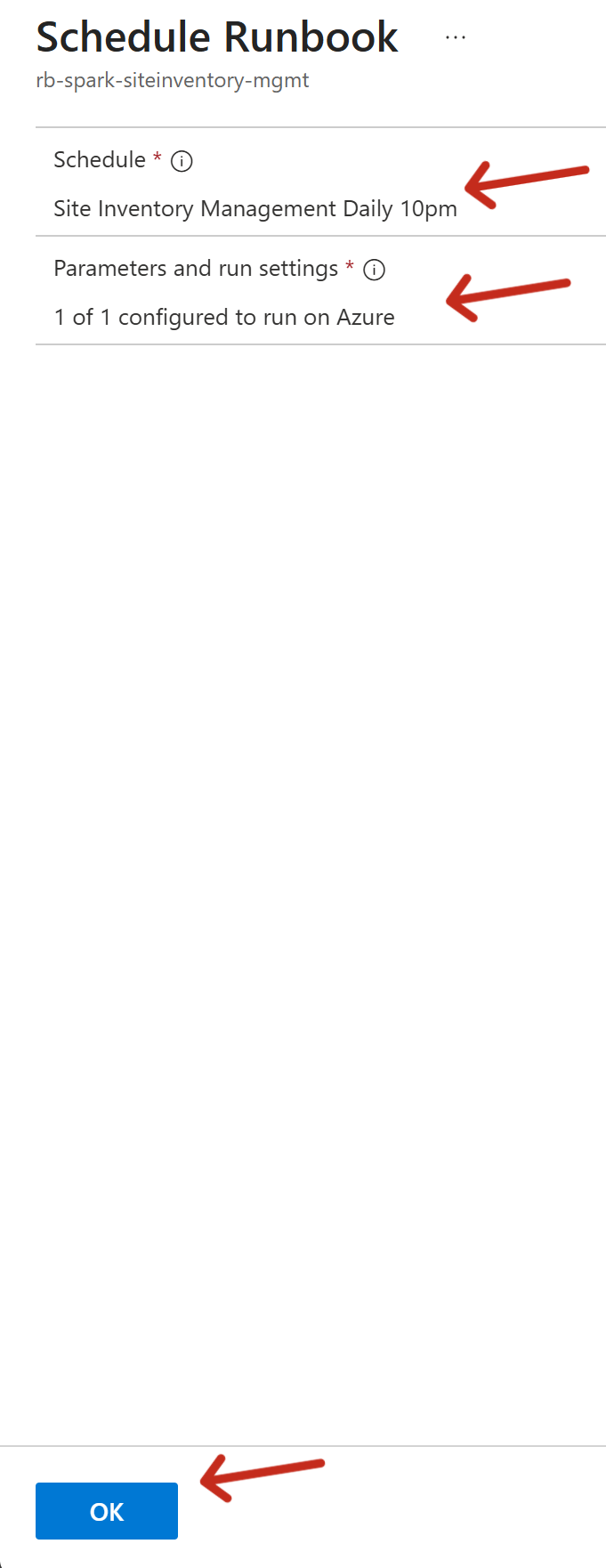 - Click Ok again in the Schedule Runbook window to save the schedule.