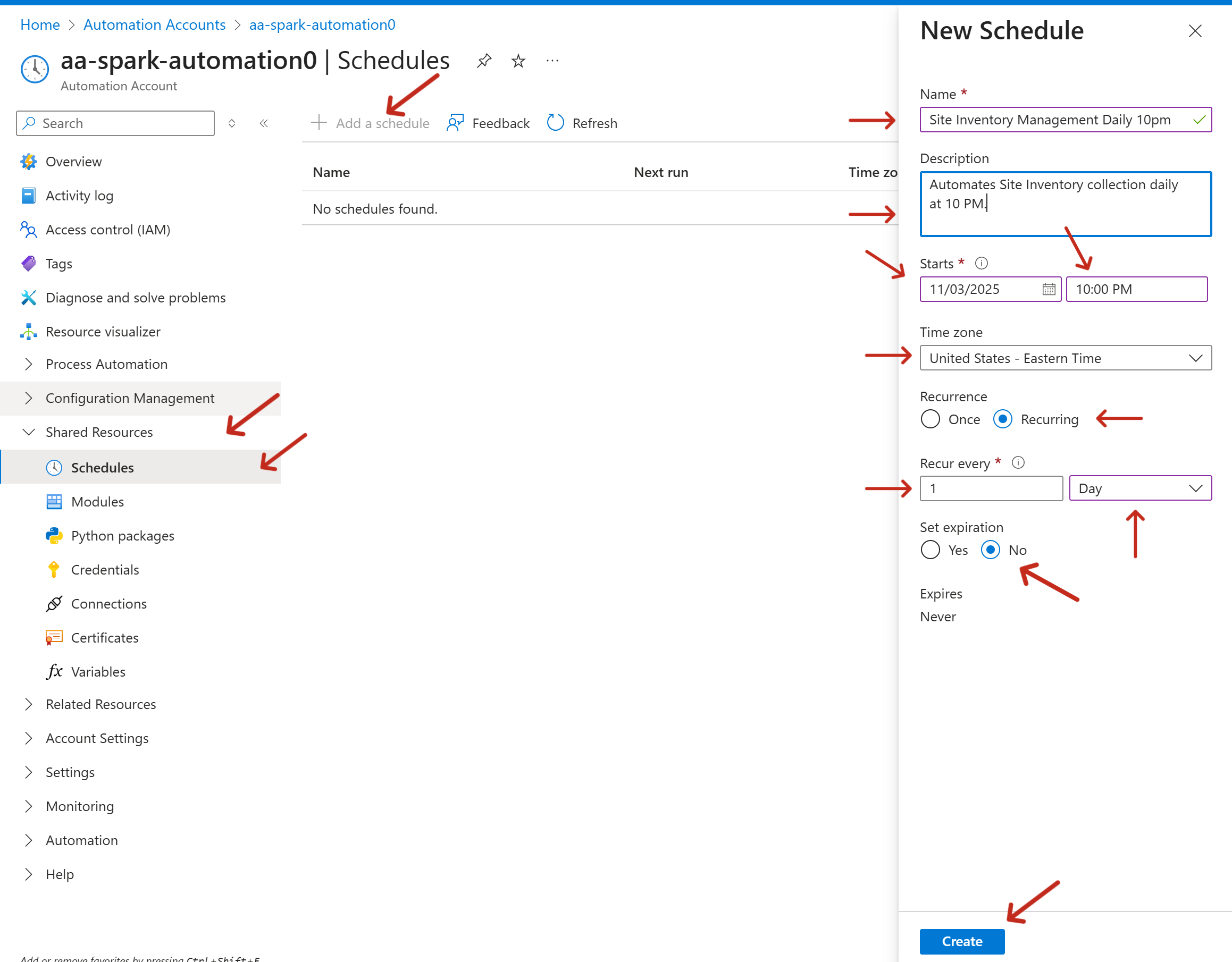 - On the left hand side under Shared Resources, click schedule and then click Add a schedule. Set the properties shown in the table and click Create.