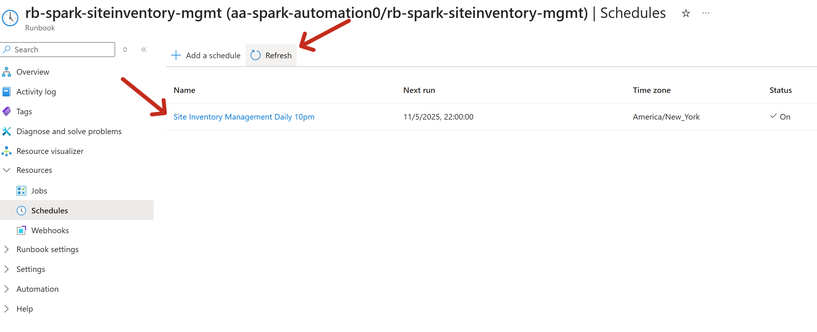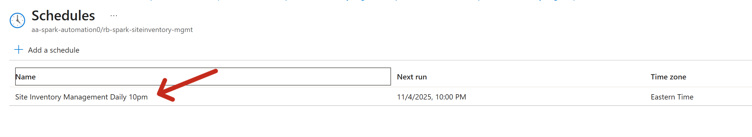 - Select the appropriate schedule (i.e. rb-spark-siteinventory-mgmt everyday at 11 pm ).
