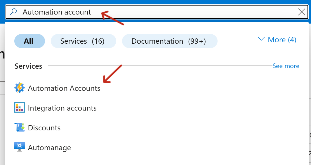 - From the top search bar, enter Automation Account and select it from the search results