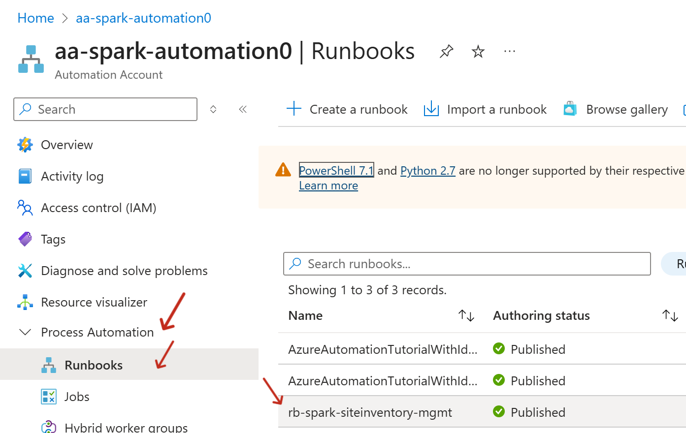 - Within the aa-spark-automation0 Automation Account, click Process Automation on the left hand side and select Runbooks. Select rb-spark-siteinventory-mgmt.