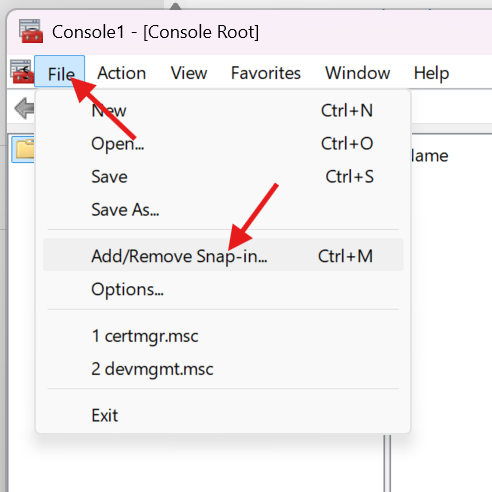 - Click on File and then Add/Remove Snap-in…“