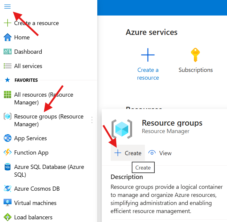 - Hover over Resource Groups, then in the fly-out click + Create to create the Resource Group