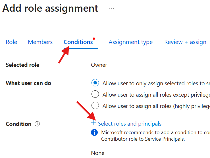 - On the Conditions tab: In the What the user can do section, ensure the Allow user to only assign selected roles to selected principals (fewer privileges) option is selected.