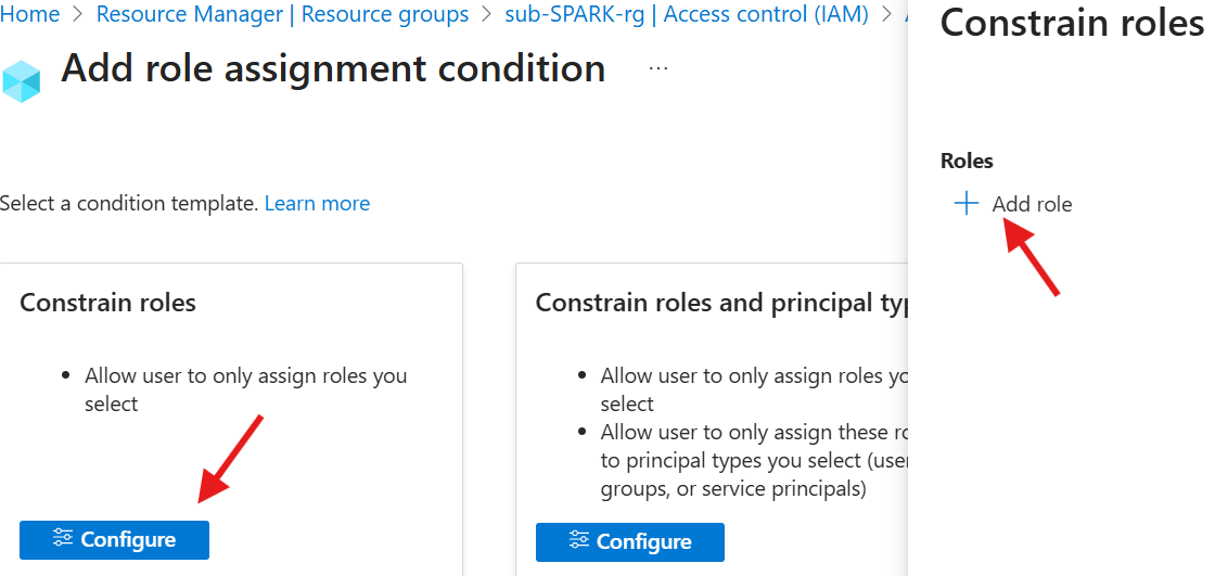 - On the Add role assignment condition tab: Under Constrain roles, select Configure