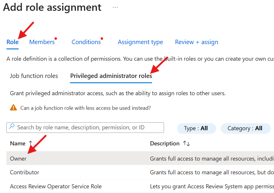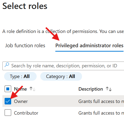 - On the Role tab, select Privileged administrator roles and select the Owner role