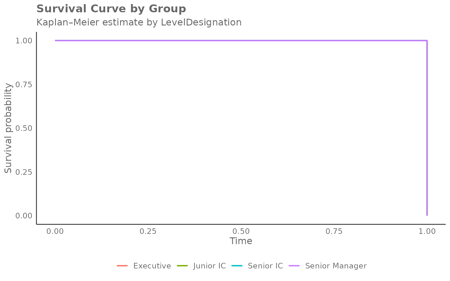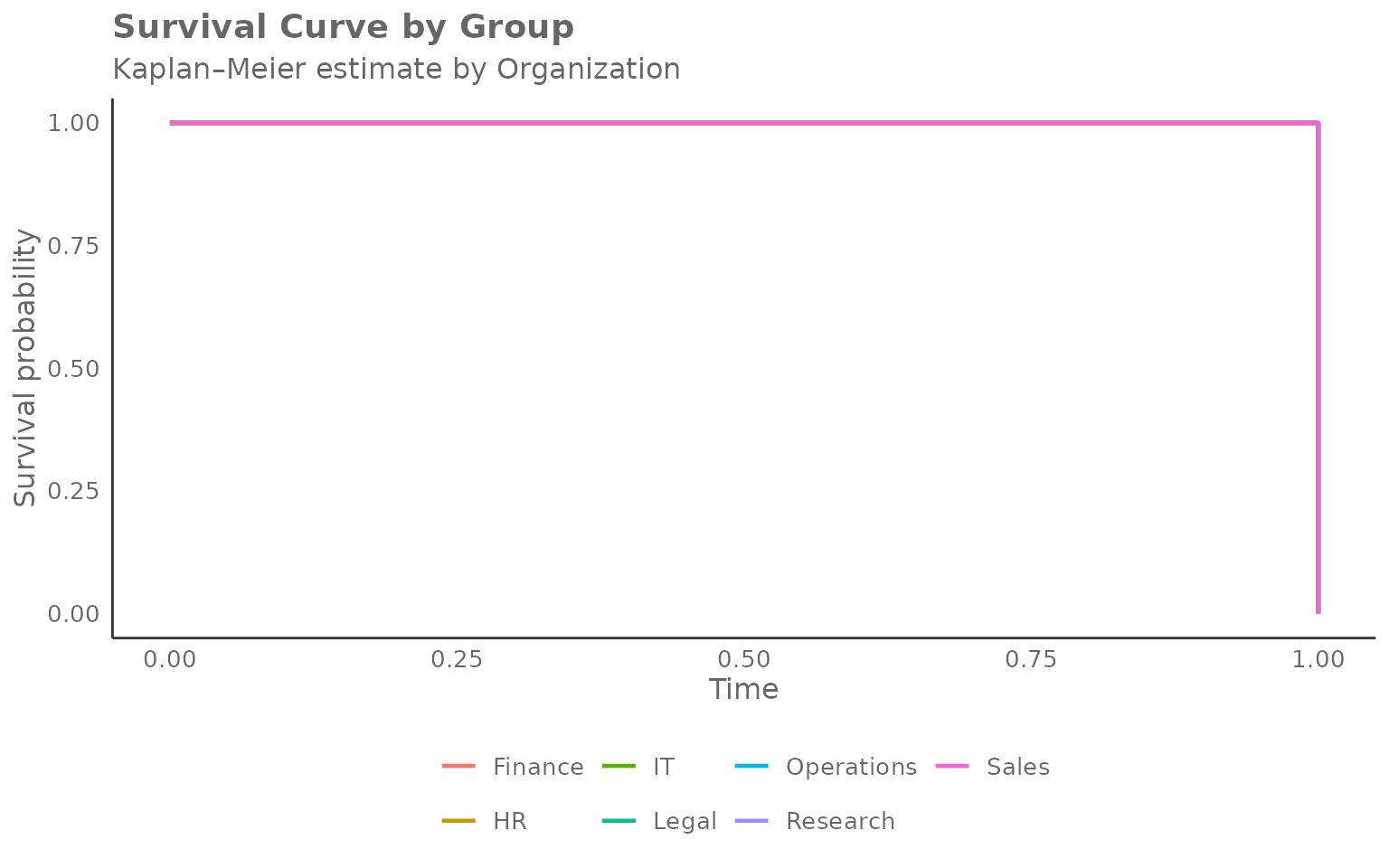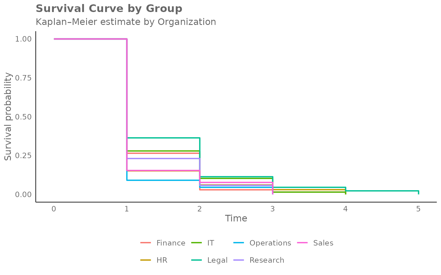 In classical survival analysis the event is typically something negative — death, equipment failure — and the y-axis probability represents “still alive / still working”. In workforce analytics the event is usually a positive milestone: first adoption of a tool, first week as a power user, first time a network or collaboration metric crosses a meaningful threshold.